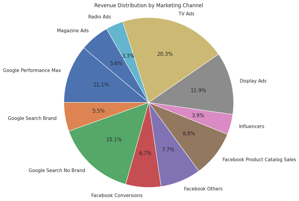 - Insights Generation: Analyze the coefficients of the model to understand the impact of each marketing channel on revenue. Identify significant contributors to revenue and their relative importance. Conduct sensitivity analysis to assess the robustness of the model to changes in marketing spend. Visualize the predicted revenue compared to actual revenue over time to validate the model’s accuracy.
