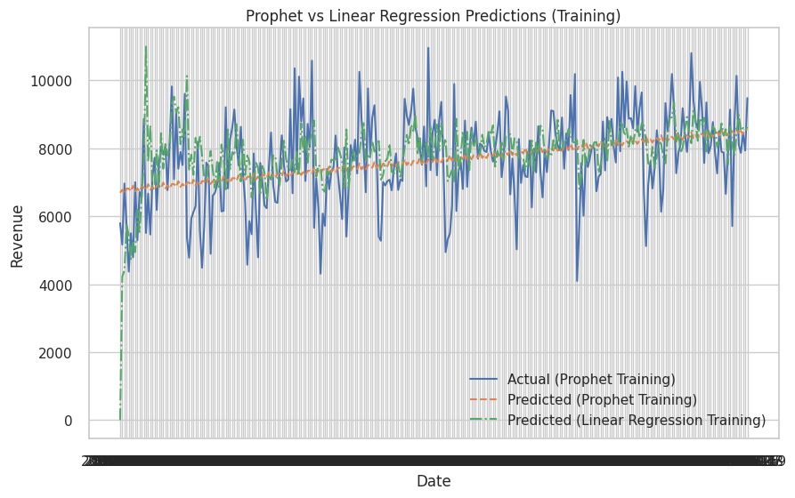 Overall, the goal of building ML models was to compare their performance in forecasting revenue over time. By evaluating metrics such as Mean Absolute Error (MAE), Mean Squared Error (MSE), and Root Mean Squared Error (RMSE), we aimed to identify the model that provides the most accurate forecasts for our specific dataset. Additionally, exploring different models helps us gain insights into the underlying patterns in the data and choose the most suitable approach for revenue forecasting in our business context.