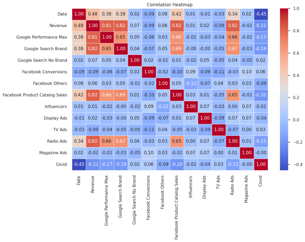 - Data Preprocessing: Check for missing values and handle them appropriately (e.g., imputation). Convert the ‘Date’ column to datetime format for time-series analysis. Explore the distribution of each marketing channel’s spend and revenue. Visualize the relationships between marketing spend and revenue over time.